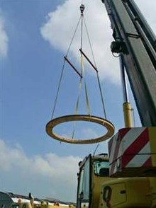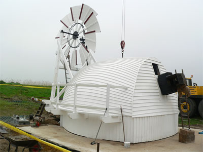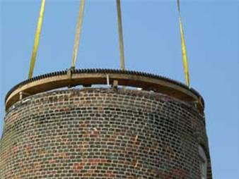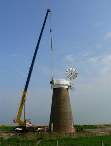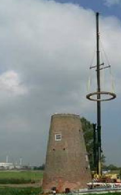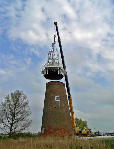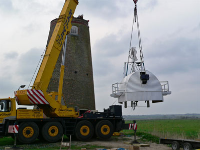 By midday everything was ready for the big lift. There was an air of anticipation as the crane lifted the cap a few feet to allow some final pieces to be assembled. The cap was then lifted further and allowed to rotate into wind. While this settled a team gathered at the top of the mill to guide the cap into place. The cap remained motionless while this team were briefed by the crane operators.