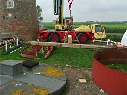A total of 27 lifts were completed by the crane. Every major component on site was repositioned in such a way as to allow the final fitting of all the key parts. The curb ring is now in place at the top of the tower, the windshaft and brake wheel were lifted through the roof and the workshop onto the base of the cap and, after necessary adjustments have been made, will be fixed into place. The wallower wheel is in place on top of the shaft and is ready to engage with the brake wheel when the cap is lifted into place.